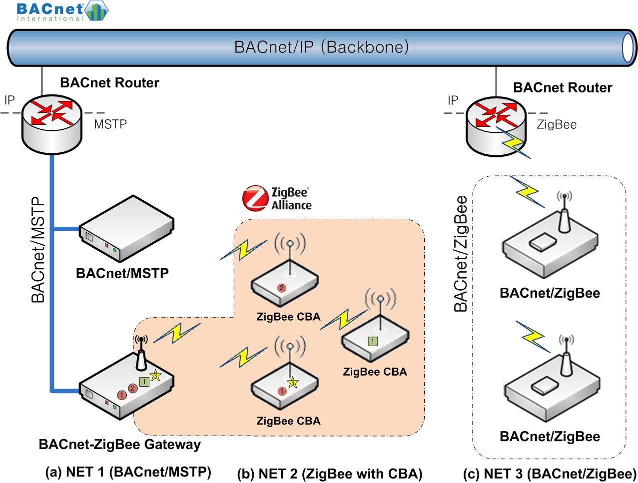 Communication networks are used to manage and control building facilities in an effective manner. The building automation control network (BACnet) is a standard data communication protocol designed specifically for building automation systems, and plays an important role as a representative building network. However, BACnet does not support a wireless channel, which would bring about several advantages, including reduced installation cost and eased placement constraints on the transceivers, as well as the introduction of flexible extensions and mobile device connectivity. Currently, the introduction and standardization of ZigBee as a BACnet wireless channel is under consideration by both the BACnet and ZigBee organizations. This paper describes a method of implementing a BACnet-ZigBee gateway.